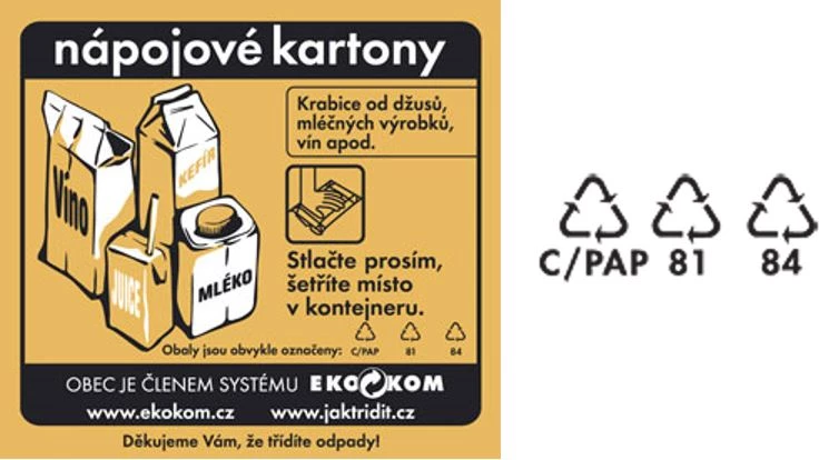 Označení sběrné nádoby na nápojové kartony a recyklační symboly nápojových kartonů (zdroj: www.jaktridit.cz)
